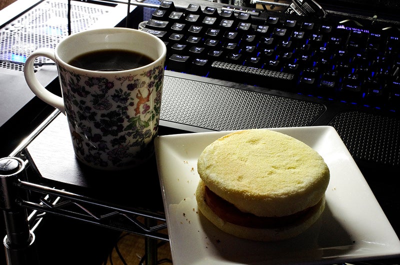 Pasco イングリッシュマフィンとフードリエ 家族の定番モーニングステーキをオーブントースターで焼いて、黒瀬のスパイスを間にしっかりと振りかけます。