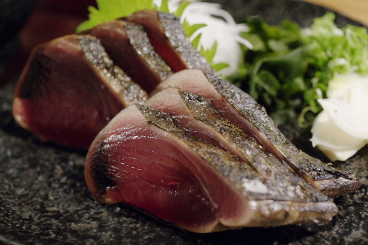 焼き入れしたばかりの鰹のたたきは温かく脂が旨いのです。