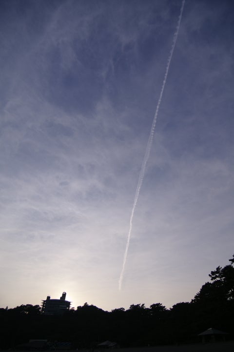 雲も多くなり夕焼けも期待できず、一条の飛行機雲がとりあえず絵になったぐらいかな。
