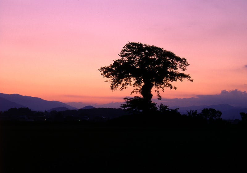 水田が広がる中に、こんもりとした丘、そこにたたずむ一本木。