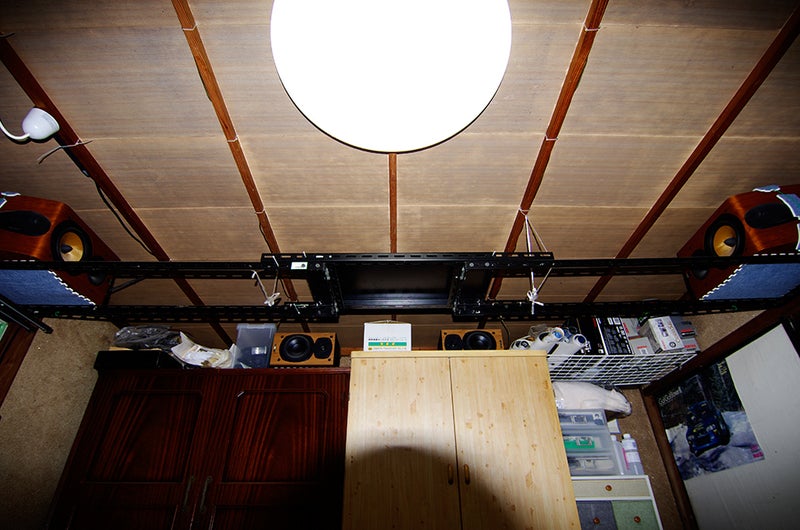 天井を左右に横切っている黒いものは、元はプロジェクターとサラウンドスピーカーの設置台です。