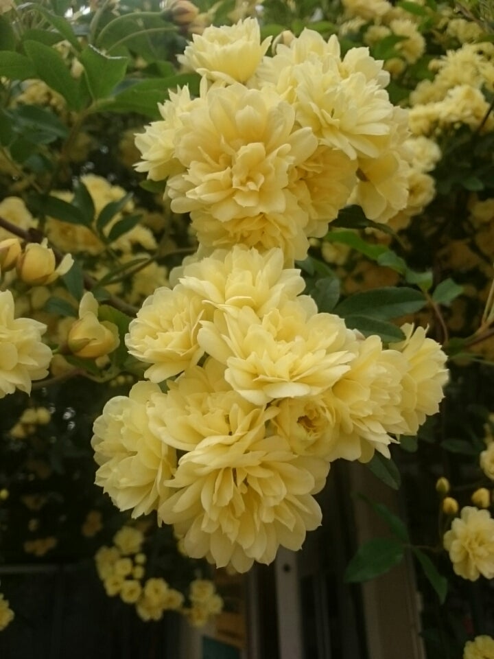 小さなガーデンの黄薔薇が軒先を蔦って、一斉に咲いています。