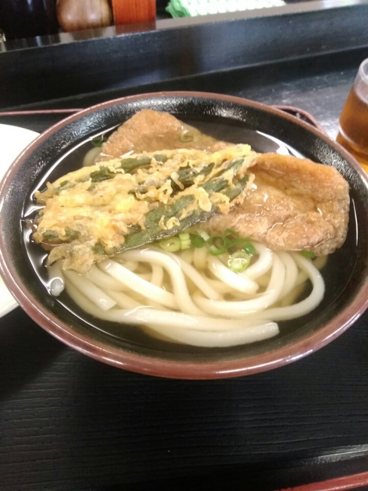 くうかいでうどん小と揚げとインゲンの天ぷら。