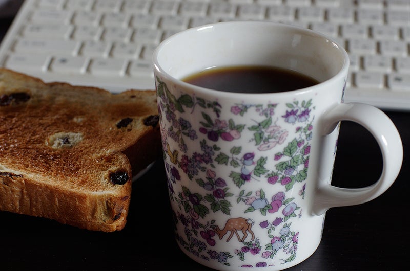 朝食はブドウパンのトースト、キリマンジャロの珈琲。