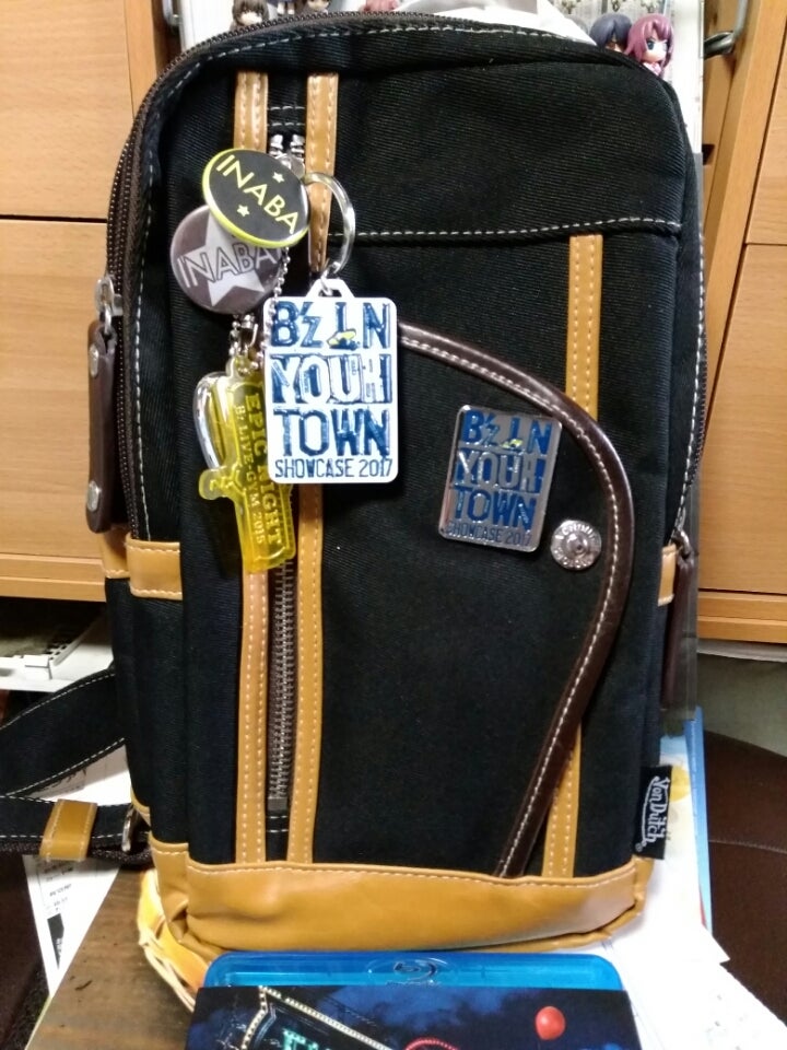 キーホルダーとピンバッジ2017年08月15日昨日、B’z IN YOUR TOWN SHOWCASE 2017のキーホルダーとピンバッジを頂いたので、さっそくカバンに着けました。徐々にボリュームアップしてます。