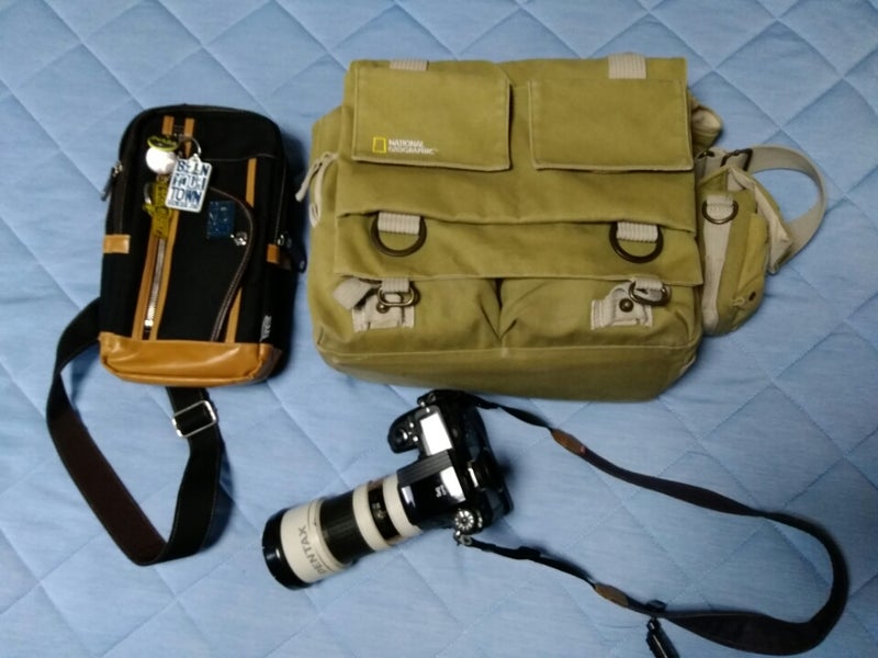 ワンショルダーバッグとカメラバッグとカメラの大きさ比較。