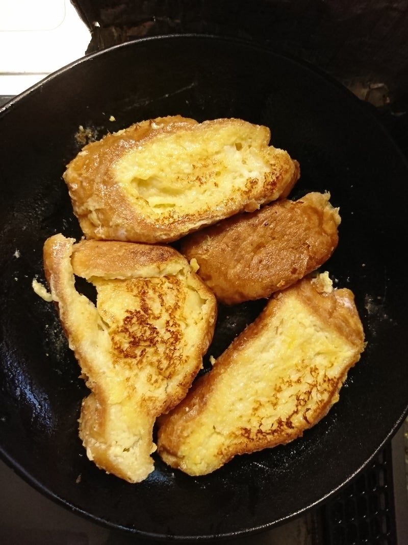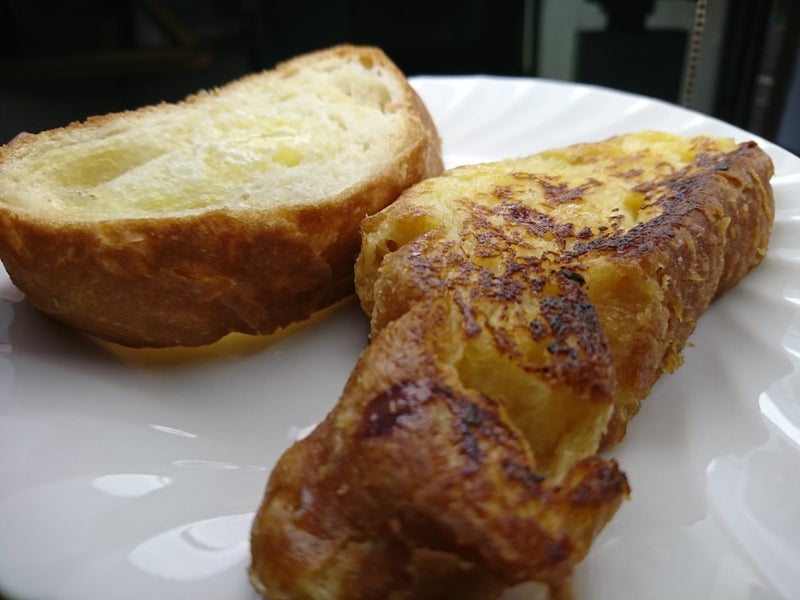 フレンチトースト2018年07月17日目の粗い塩バターフランスパンをフレンチトーストにしました。DONQよりは油こくないし甘さ控えめです。美味しくいただきました。あとはバターをのっけてトーストにしただけのものもいただきました。安い市販品だけで極上の朝ご飯です。