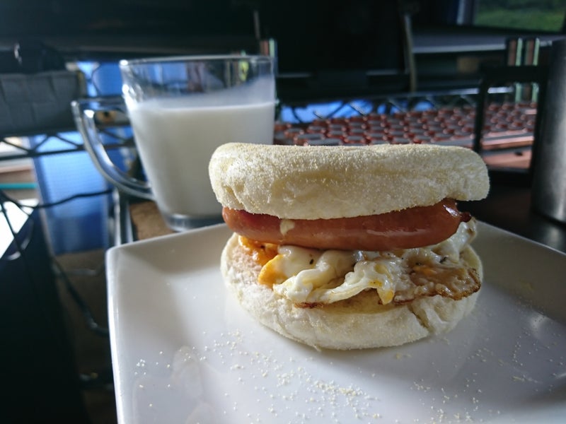 朝食2018年08月02日スキレットでソーセージと卵を焼いて、トースターでPascoのイングリッシュマフィンを焼いて、焼きあがったマフィンにマヨネーズとケチャップを少量塗って、卵とソーセージを載せて挟みます。後は牛乳を一杯。スキレットが熱いうちに汚れを拭き取り、キャノーラ油を薄く塗り、同じく蓋にも塗ります。スキレットは手入れを怠るとすぐに錆びますから。こんな量のご飯で太るのは勘弁してほしい。