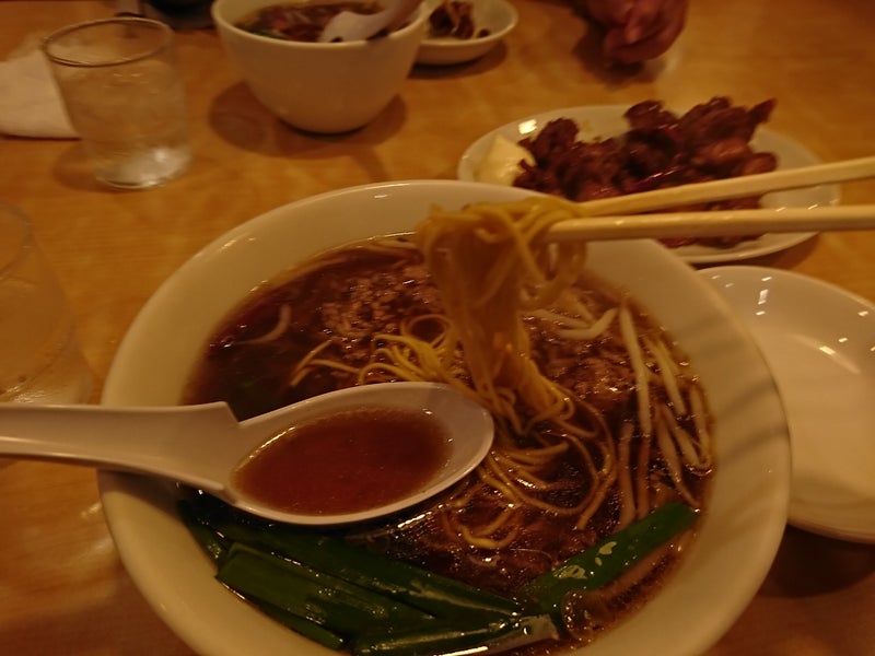 台湾ラーメン2018年09月14日挽き肉とニラとモヤシと唐辛子。ちょっと醤油味の濃いめの甘辛いラーメンです。一緒に地獄唐揚げという唐辛子が7本も入っている甘辛い唐揚げも頂きました。唐辛子は割ってないのでピリ辛程度です。割るととんでもなく辛くなります。