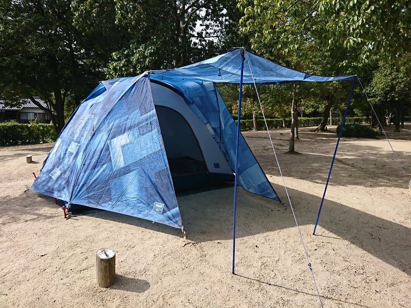 砂川公園です。2018年10月22日テント設営に1時間掛かりました。テントに付属のペグとハンマーが樹脂なので、打ち込んだ衝撃が吸収されてなかなか刺さりません。両方とも金属製に代えないといけないですね。しかし暑いです。汗だくです。