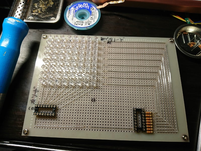 作成中2019年07月03日LEDの数が足りないので8*8の64個のドットディスプレイを作成中です。後で64個追加できるように配置していますが、本当に増やせるだろうか。半田も半田吸い取り線も半田メッキ線も残りわずかなので、先ほど発注しました。電子部品は必要になってもすぐには手に入らないので作成欲が下がっちゃう。