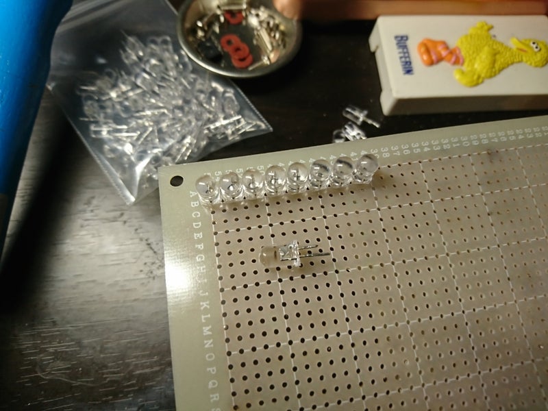 並べ直し2019年07月12日LEDの大きさが微妙に大きく、ピッタリくっつけて並べられないので、ヤスリで削って並べ直してます。128個並べるつもりなので頑張って削ります。同じ作業と言うのが苦手なので、苦行みたいです( ̄∇ ̄)