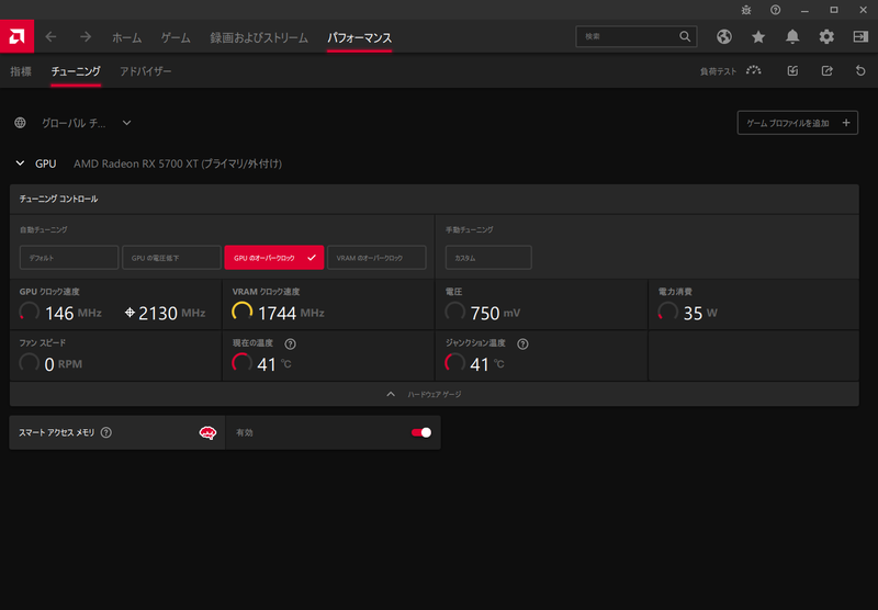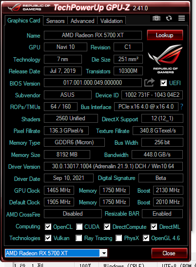 使用しているビデオカードは、AMD RADEON RX5700XTが搭載されたASUS ROG-STRIX-O8G-GAMINGです。